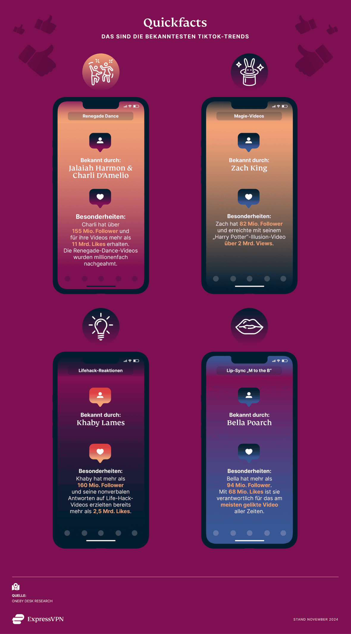 Tanz- und Lip-Sync-Challenges bleiben die Dauerbrenner der Plattform. TikTok-Nutzerin Bella Poarch beispielsweise wurde durch ihr Lip-Sync-Video zu „M to the B“ weltbekannt und setzte mit eingängigen, kreativen Inhalten neue Maßstäbe. Darüber hinaus bringt 2024 auch vielfältige und überraschende Inhalte hervor. Ein gerade entstehender Trend ist das sogenannte „Deinfluencing“ – der Gegenentwurf zum klassischen Influencer-Marketing, bei dem Nutzer von überteuerten Produkten abraten und stattdessen auf bewussten Konsum setzen. Dieser Trend gewinnt an Bedeutung, da sich viele von der Konsumüberflutung und dem Einflussdruck der sozialen Medien distanzieren möchten.