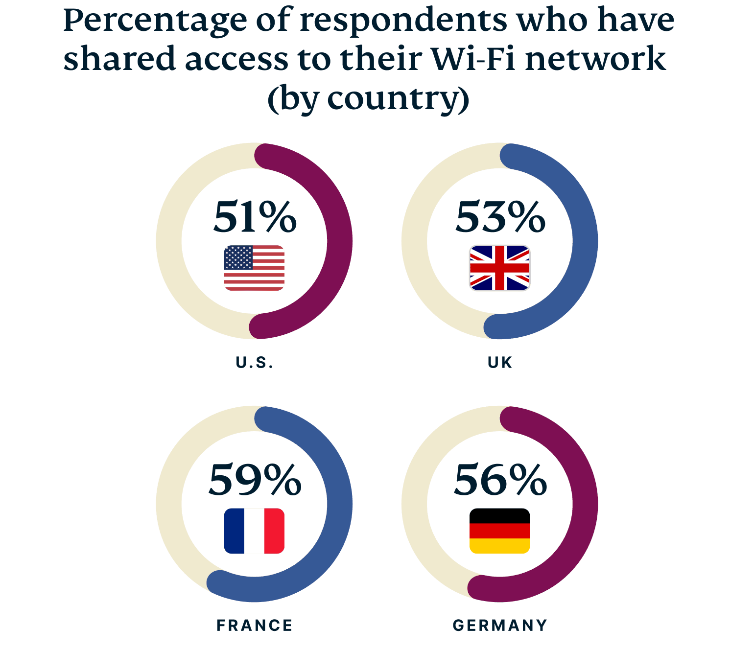 So, it’s not entirely unexpected that a high percentage of people across all four countries willingly engage in this act of sharing—our survey reveals that an average of 55% of respondents admit to sharing their Wi-Fi password with others.