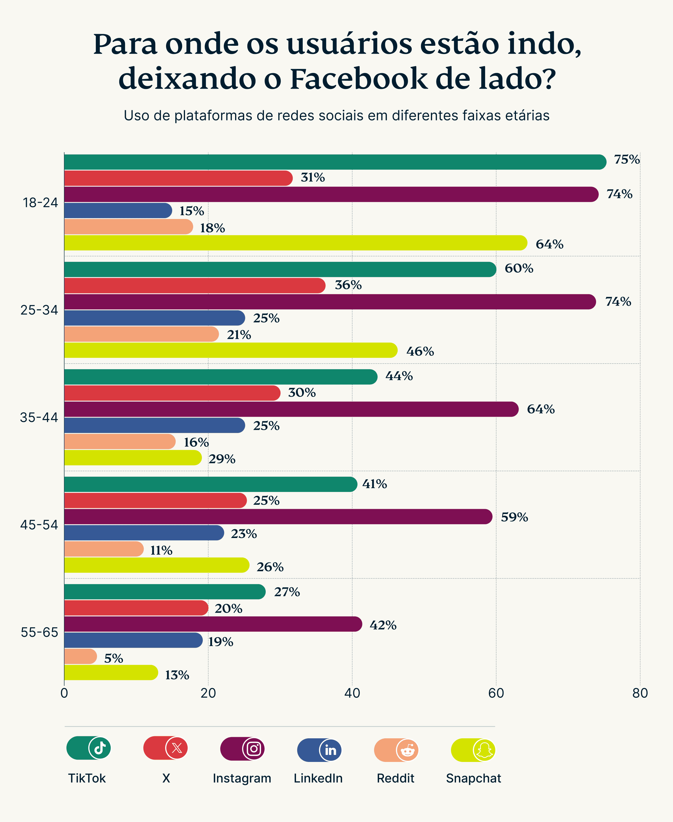 Ainda assim, usuários mais velhos também estão explorando outras plataformas. O LinkedIn é usado por 25% das pessoas entre 45 e 54 anos e por 19% dos usuários de 55 a 65 anos, mostrando que a rede tem apelo até fora dos círculos tradicionais do mercado de trabalho. Plataformas como X e Reddit também atraem entre 10% e 31% dos usuários dessas faixas etárias, especialmente para atualizações em tempo real e discussões comunitárias.